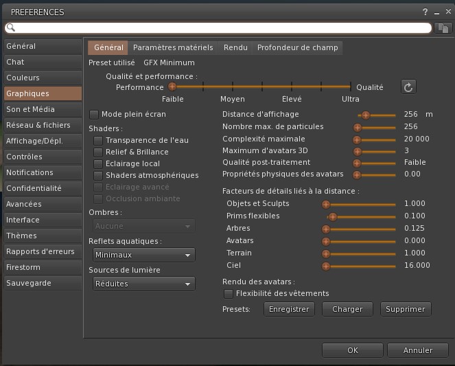 - Créer un préréglage graphique à très basse consommation de ressources. J’ai configuré ceci qui peut vous servir d’exemple.