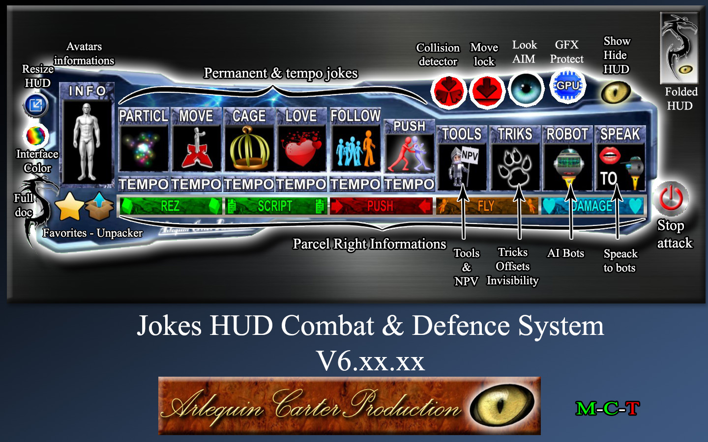 J’essaie de tenir les fonctionnalités du JOKES HUD à jour en fonction des évolutions de LSL Script pour vous offrir une meilleure protection ainsi que des réponses efficaces à d’éventuelles attaques malveillantes et aussi pouvoir répondre de façons radicale pour calmer les agresseurs compulsifs.