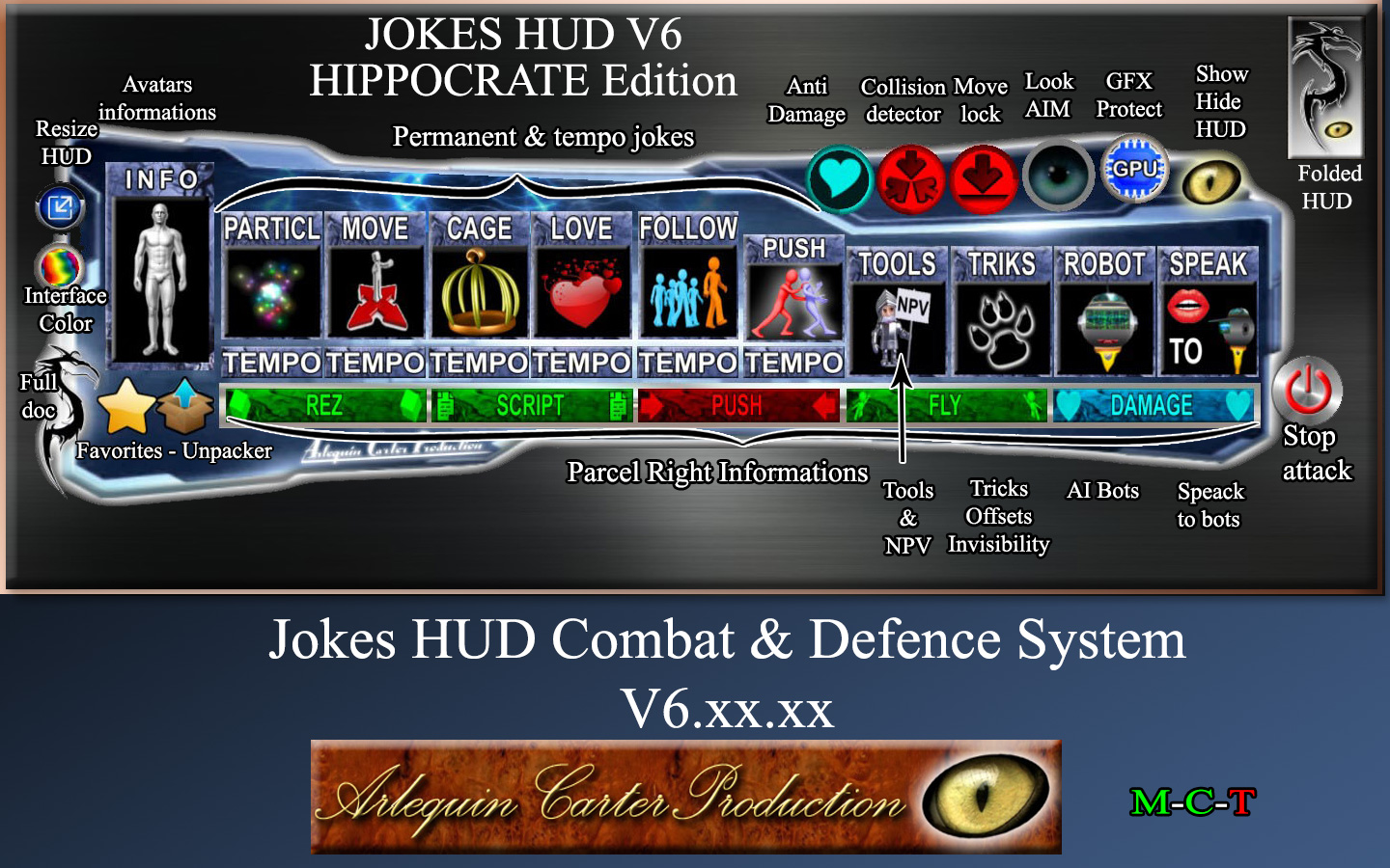 J’essaie de tenir les fonctionnalités du JOKES HUD à jour en fonction des évolutions de LSL Script pour vous offrir une meilleure protection ainsi que des réponses efficaces à d’éventuelles attaques malveillantes et aussi pouvoir répondre de façons radicale pour calmer les agresseurs compulsifs.