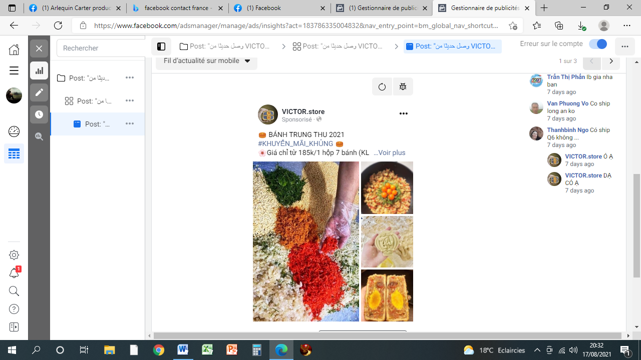 Le plus comique est que la page Facebook existe encore un mois plus tard le 04/09/2021. J’hallucine complètement et l’annonce sponsorisée sur mon dos, le 10/08/2021 aussi. Les mecs n’ont même pas été virés. FB n’est visiblement pas très regardant du moment que cela rempli les caisses.