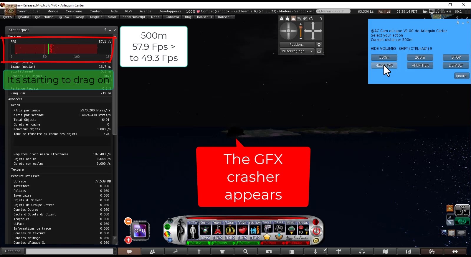 1. L’action sur les SHIFT+CTRL+ALT+9, désactive l’affichage de tous les objets. Cela à donc pour effet de ne plus afficher les objets crashers de carte graphique. Toutefois, plus aucun objet ne s’affiche même votre corps si celui-ci est en mesh. Ce peut être un peu frustrant mais c’est efficace si vous arrivez à le faire à temps.