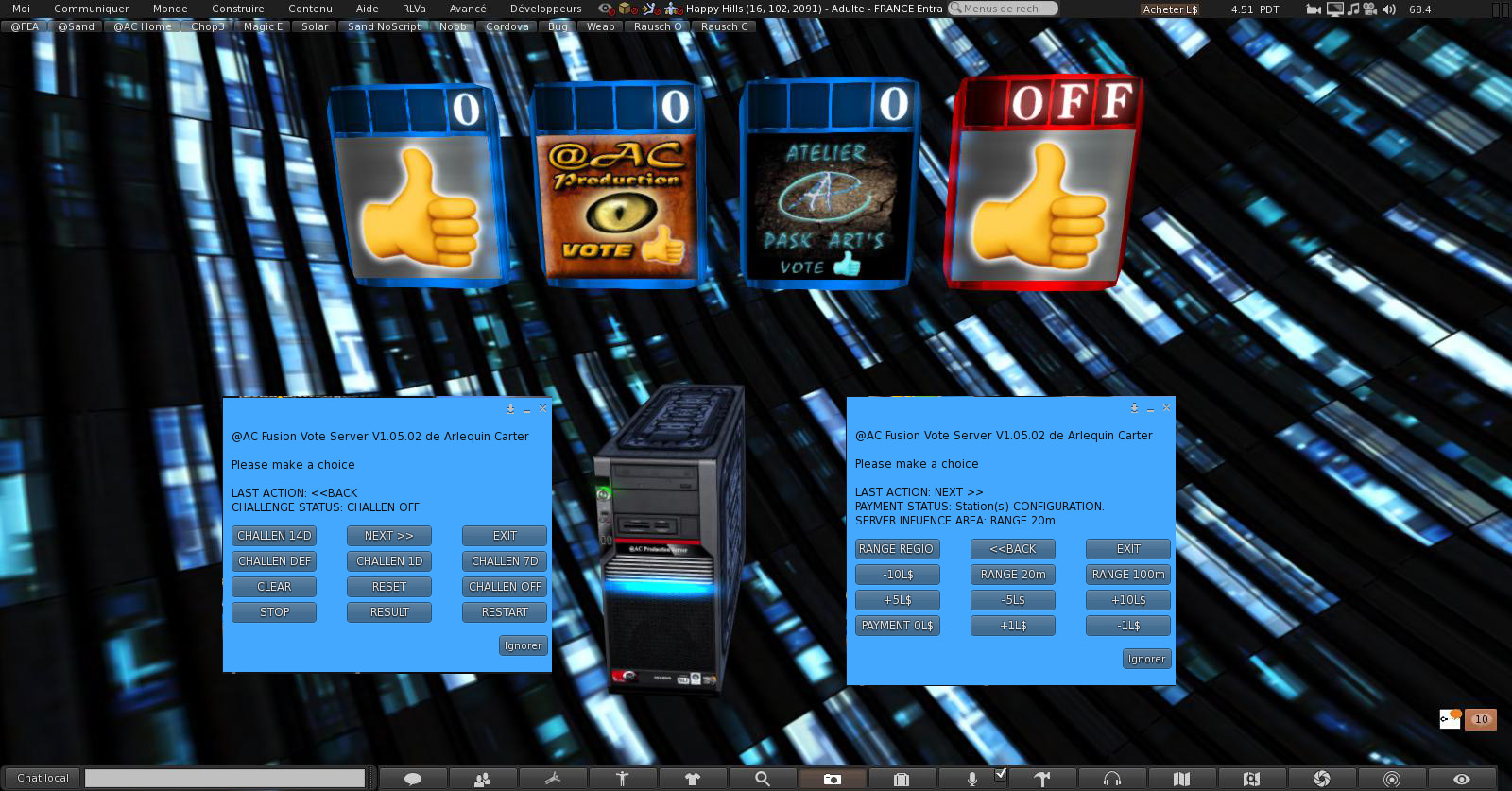 Le Système de vote fusion, fonctionne avec des stations individuelles configurables par une notecard et un serveur local central avec lequel l’utilisateur peut envoyer des commandes globales.