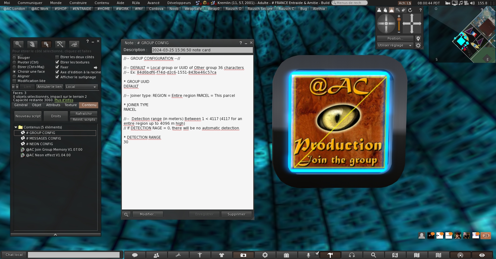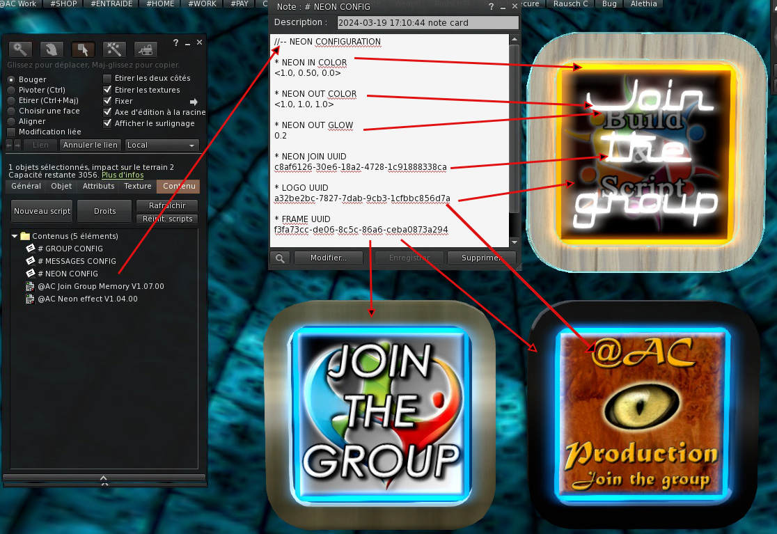 – Le réglage du groupe est par défaut celui du terrain où vous posez le Darklight Guest, cependant, vous pourriez avoir besoin d’affecter un autre groupe si, par exemple, vous avez une boutique déporté secondaire ou un terrain avec deux parcelles et deux groupes différents. Dans ce cas, vous pouvez mettre n’importe quel groupe en entrant son UUID dans cette fiche de configuration.