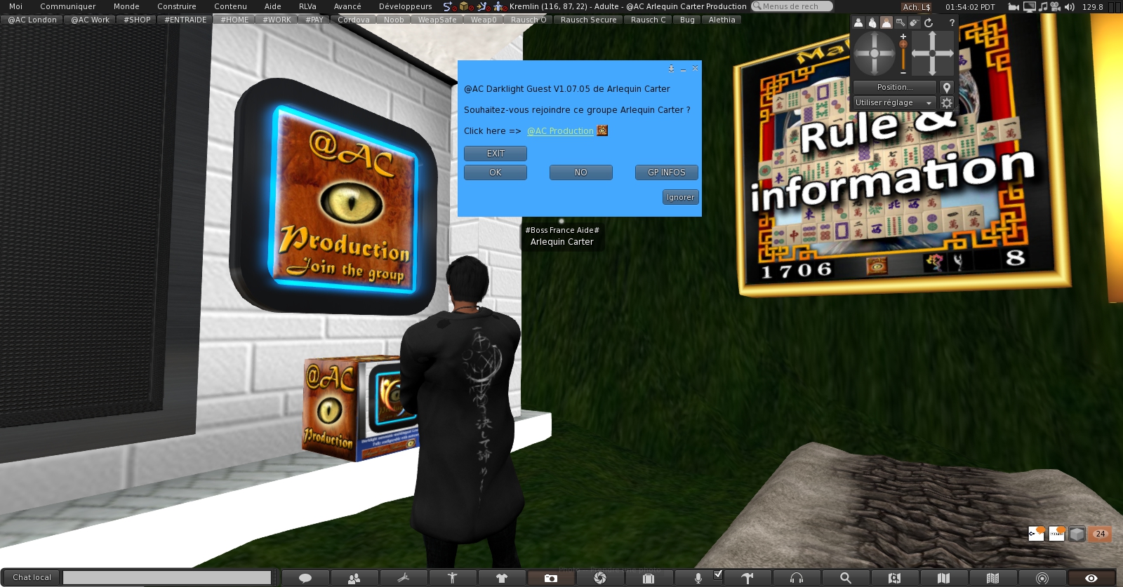 Un inviteur de groupe peut-être un simple click sur un panneau qui ouvre la fenêtre d’inscription. L’utilisation du « Sensor » du lsl script, qui va envoyer un message à quiconque passe dans la zone de détection.