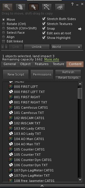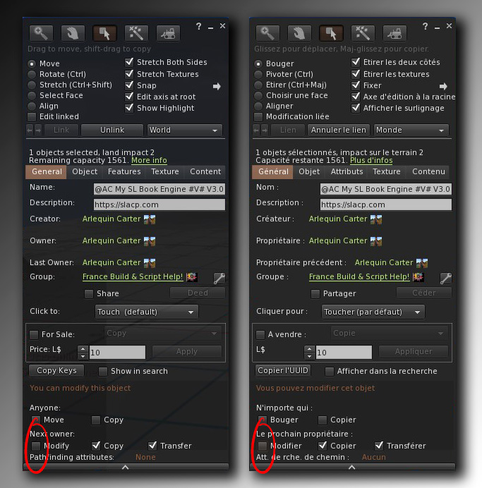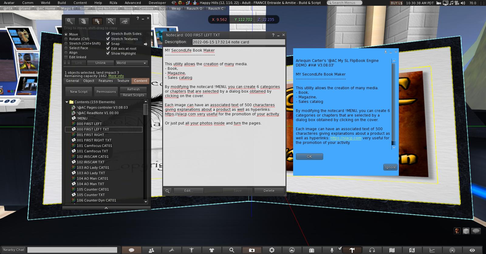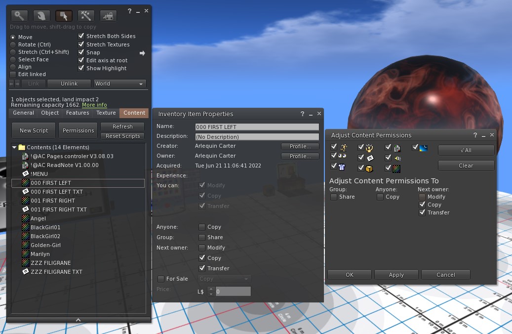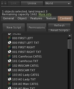 Attention toutefois, les droits des photos et des notecards doivent rester copiables et transférables, sinon vous aurez des erreurs de script qui ne pourra pas lire les fichiers verrouillés. Encore une restriction de Linden lab, on n’y peut rien.