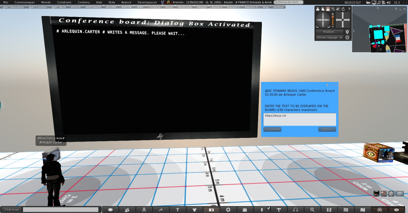 Le « Dynamis Nexus Conference Board » est un tableau d’affichage dynamique, interactif de grande capacité textuelle de 80 caractères sur 20 lignes, soit 1600 caractères. Il est en Mesh et fait 101 SLI, ce qui est peu, vu la capacité importante d’affichage.