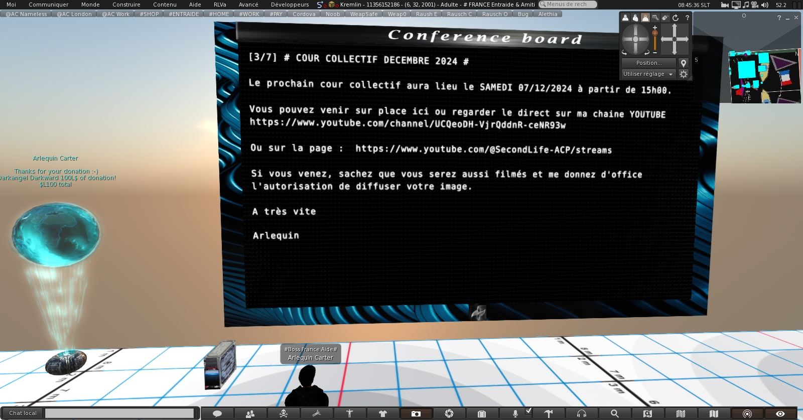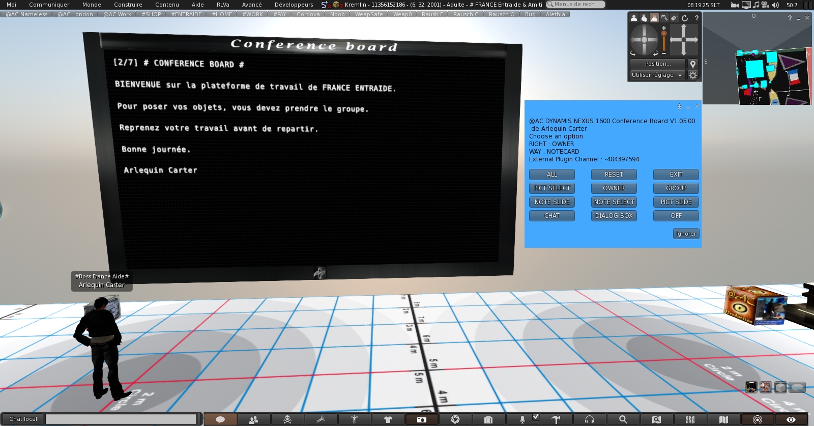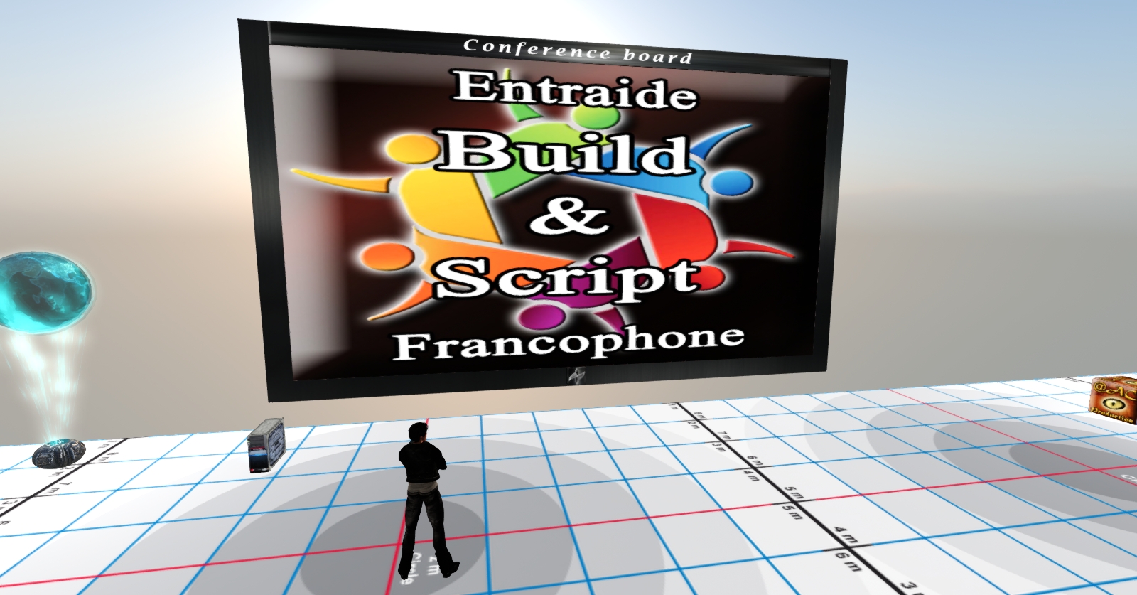 - Servir de panneau d’affichage de type message board et diffuser en boucle des notecards d’informations, illustrés par des images et liens Internet,